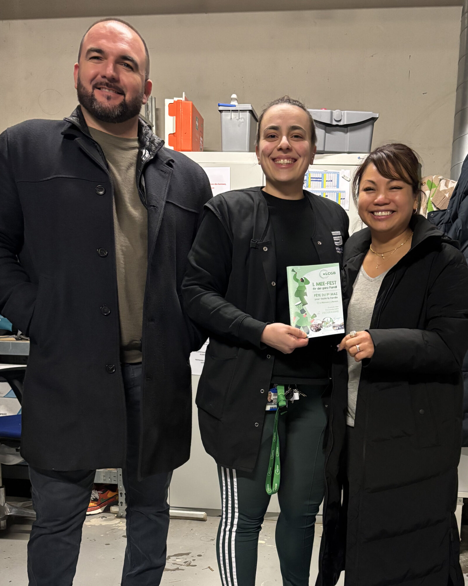 Darüber hinaus wurde bei Samsic, in Anwesenheit der Delegierten des LCGB, eine Verteilaktion organisiert, um die Arbeitnehmer über den Kollektivvertrag, die neuen Bestimmungen im Zusammenhang mit der Rentenreform sowie über den elektronischen Krankenschein (eCIT) zu informieren.
