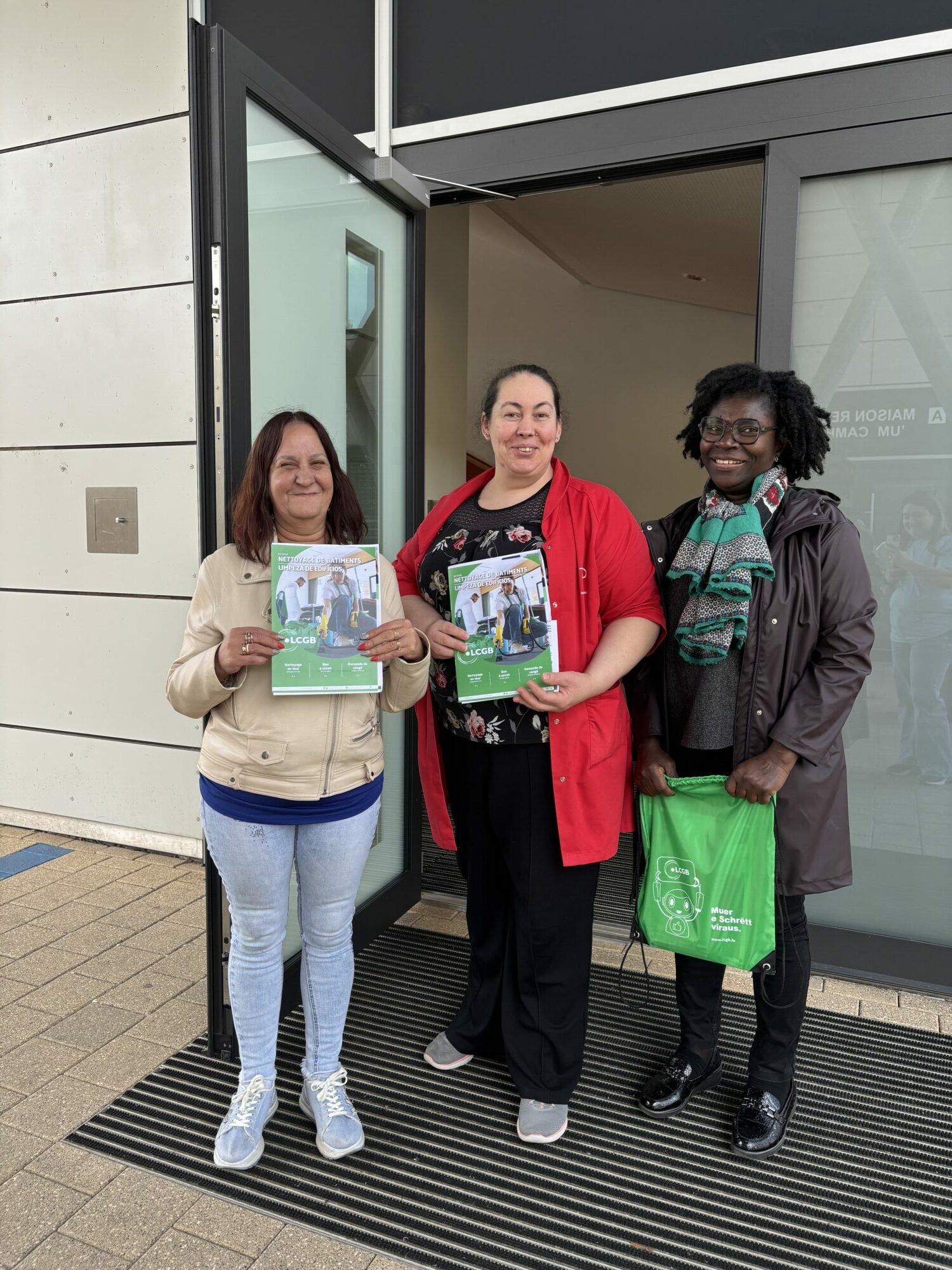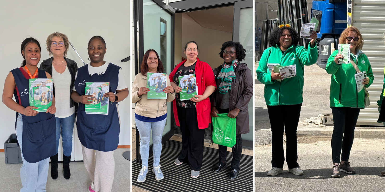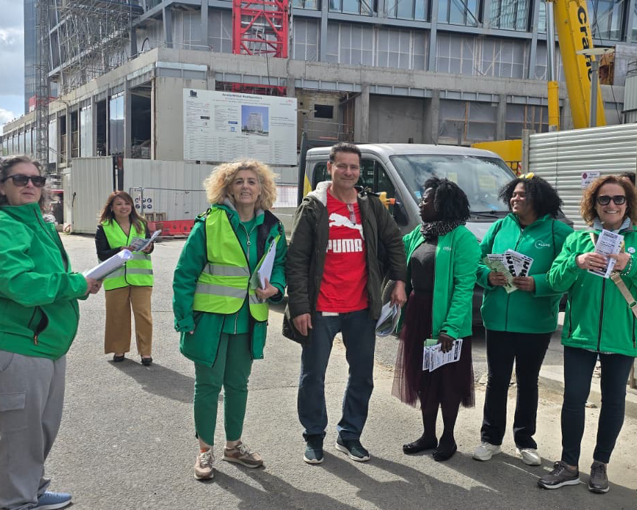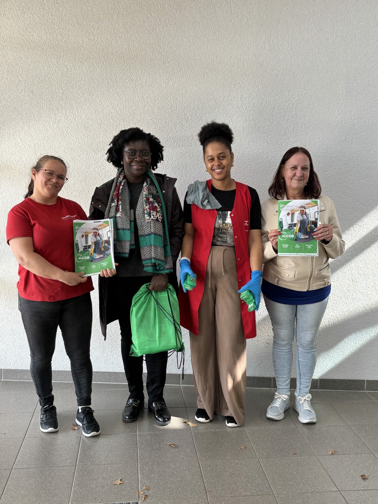 Im Rahmen einer Informationstour bei Atalian Global Services, Dussmann Service, und anderen Reinigungsunternehmen händigten die Delegierten und den Beschäftigten Informationsmaterial aus.